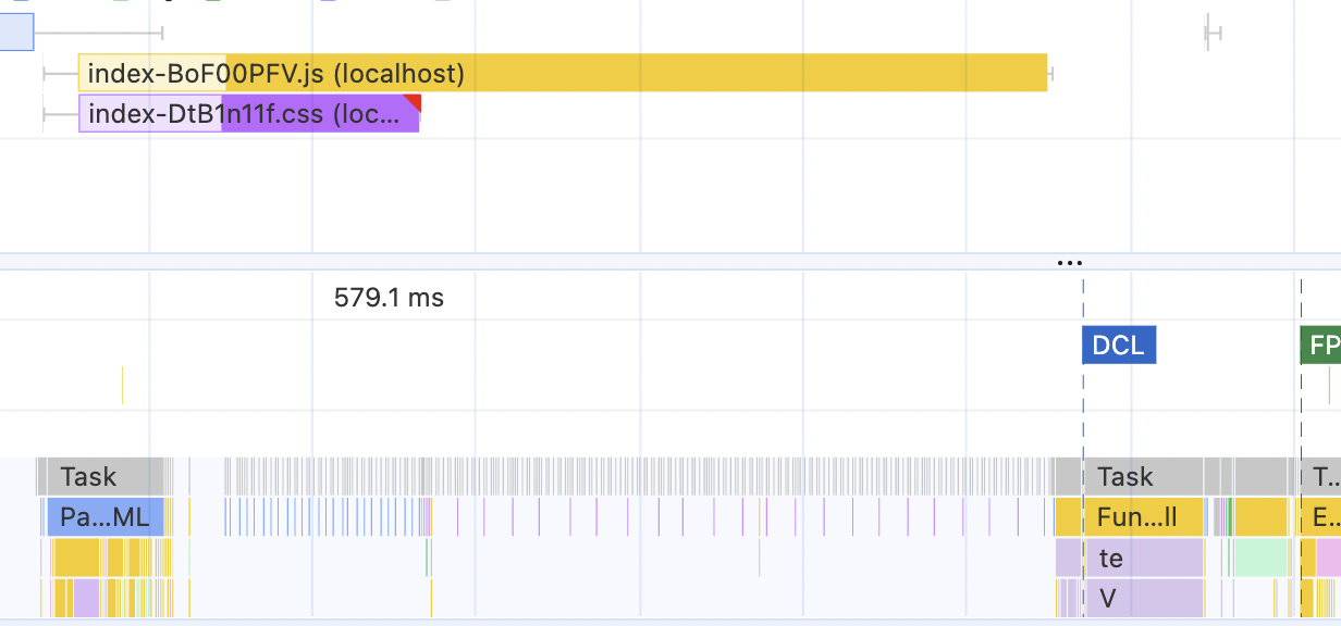 From here, I can see that I have an incredibly fast server and fast and small bundles. None of the network tasks are a bottleneck; they don't take any significant time, and between them, the browser is just chilling and doing its own thing. So, if I wanted to speed up the initial load here, I need to look into why Parse HTML is so slow - it's the longest task on the graph.