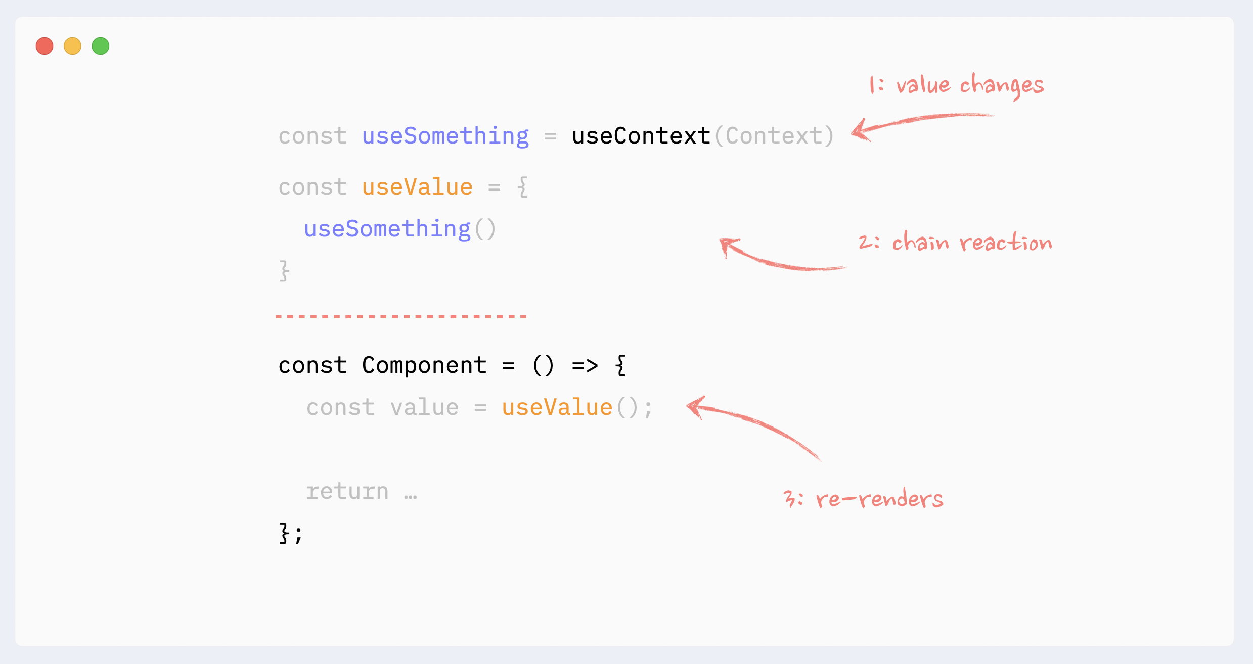 - if the hook uses Context and Context’s value changes, it will trigger an unpreventable re-rerender of the “host” component