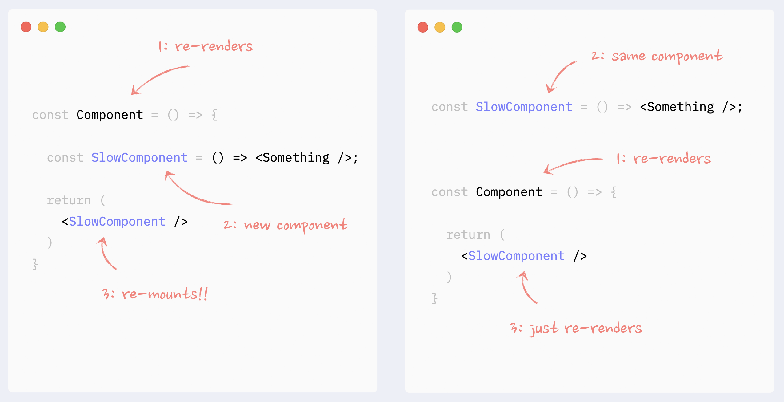However, if re-renders happen too often and/or on very heavy components, this could lead to user experience appearing “laggy”, visible delays on every interaction, or even the app becoming completely unresponsive.