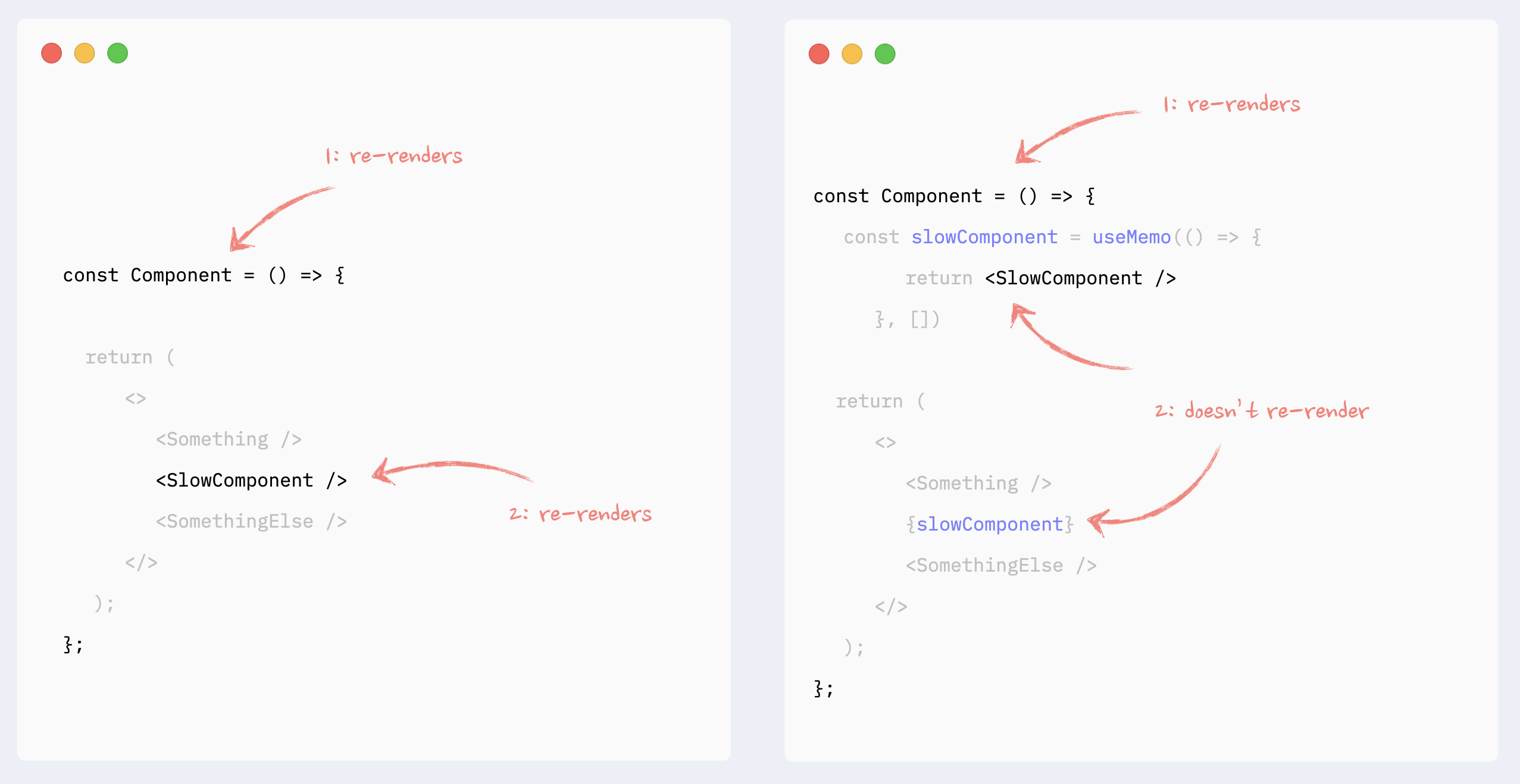 Can be useful when a few heavy components are independent from the state, but can’t be extracted as children as a group.