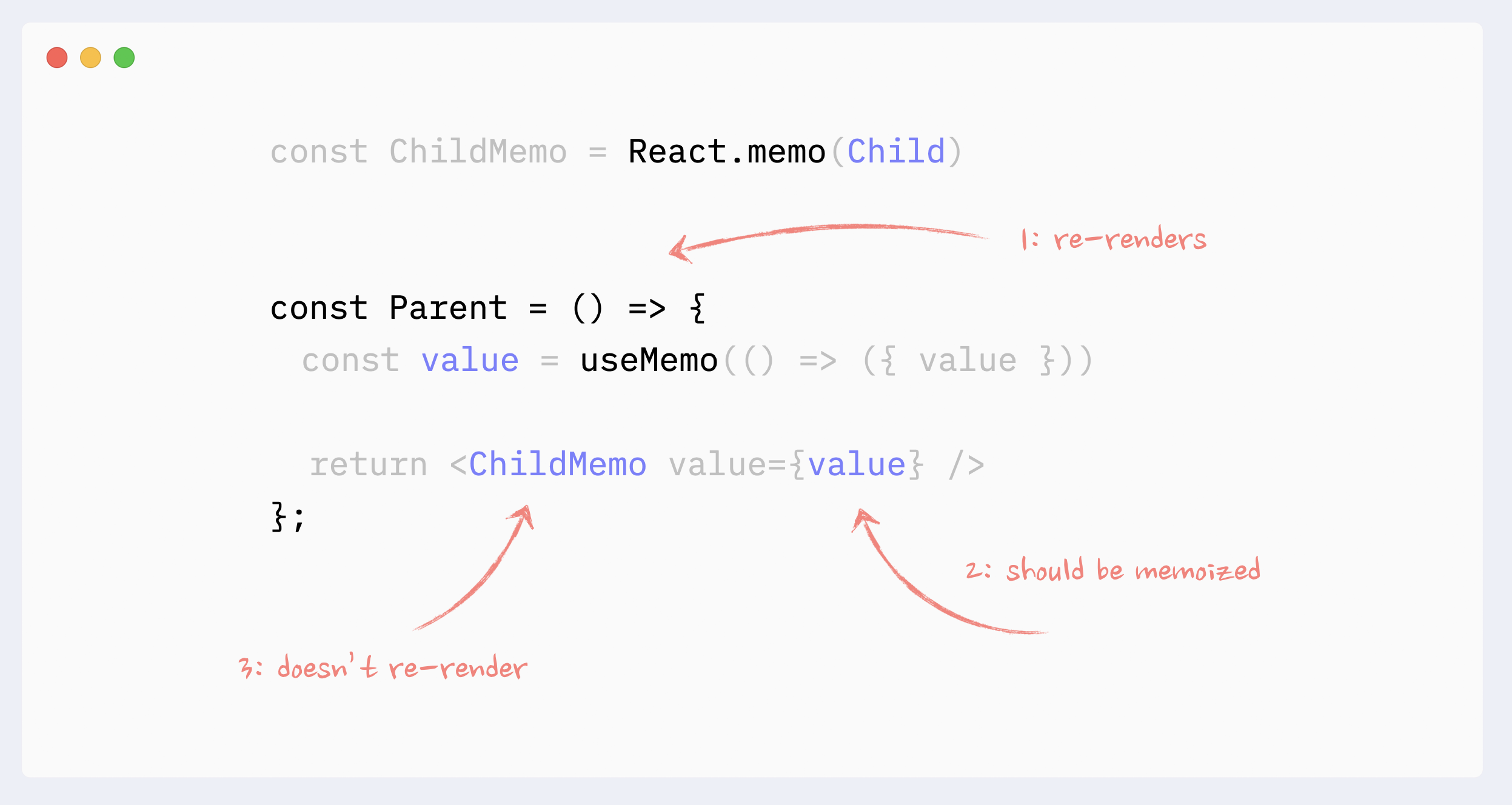 If a child component is wrapped in React.memo, all props that are not primitive values have to be memoized