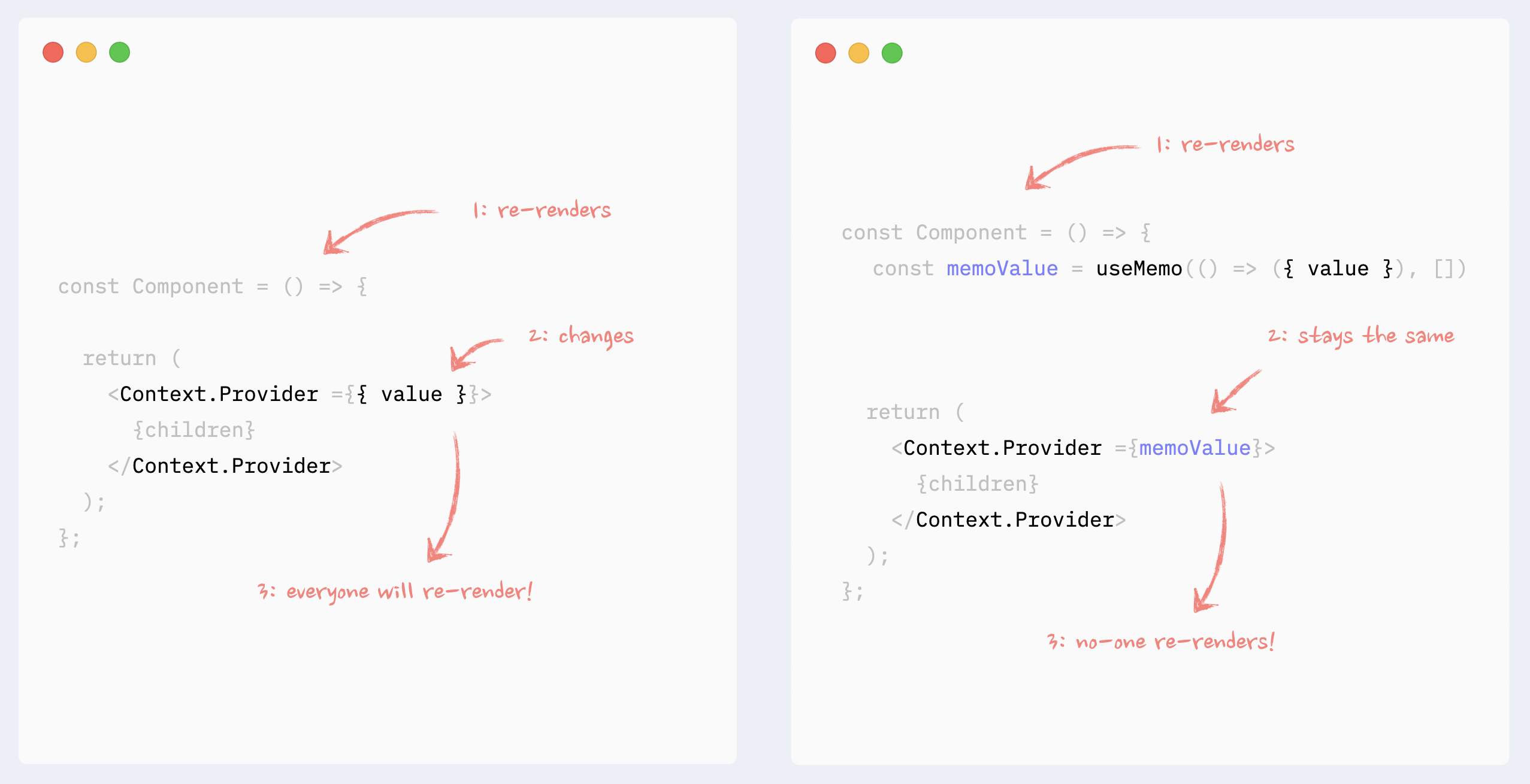 If Context Provider is placed not at the very root of the app, and there is a possibility it can re-render itself because of changes in its ancestors, its value should be memoized.