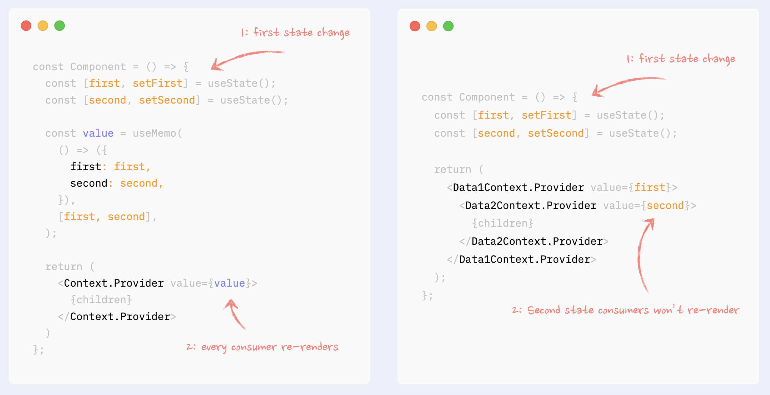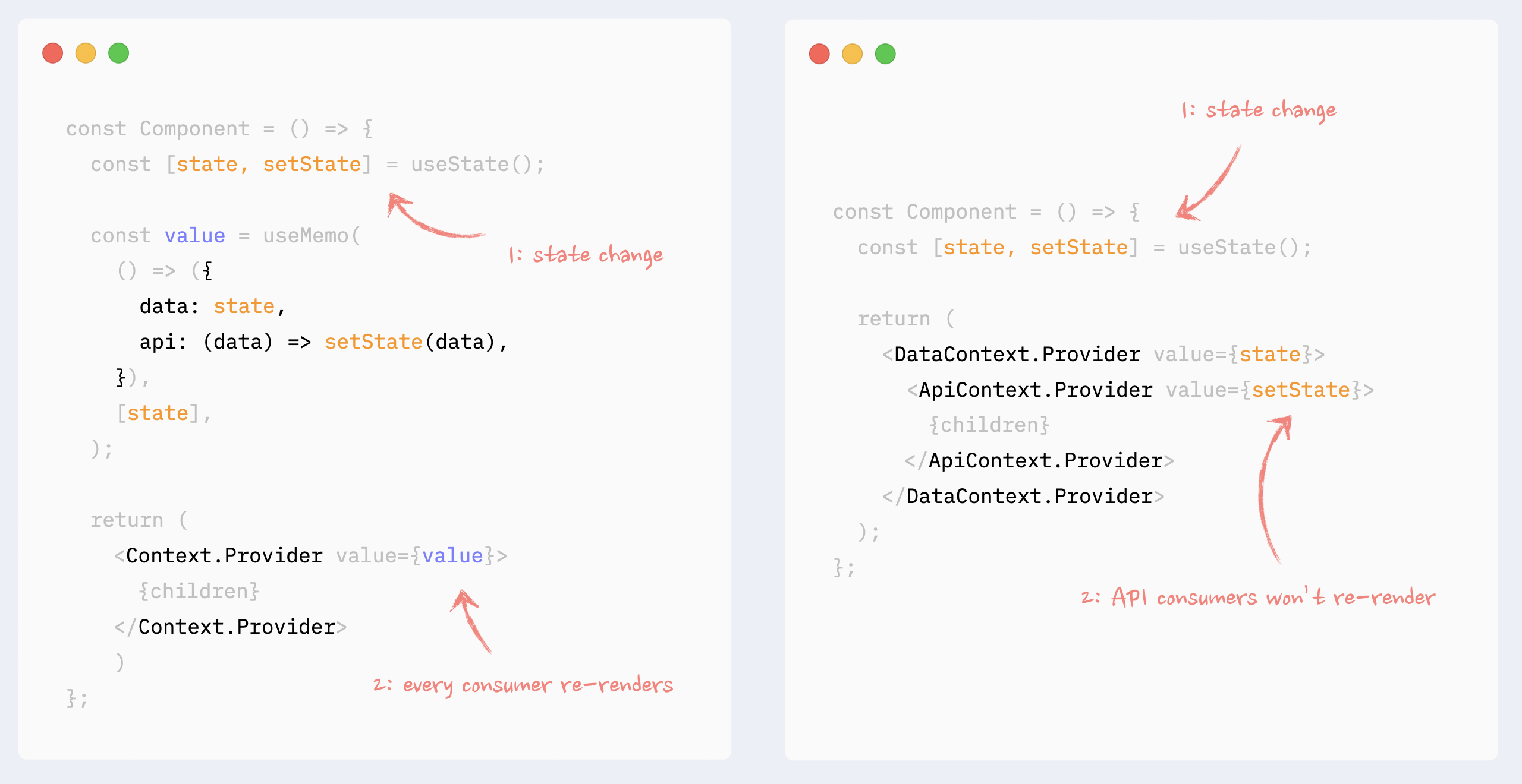 If in Context there is a combination of data and API (getters and setters) they can be split into different Providers under the same component. That way, components that use API only won’t re-render when the data changes.